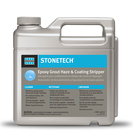 STONETECH® Epoxy Grout Haze & Coating Stripper is a fast-acting, water-based gel designed to safely remove tough epoxy grout haze and various coatings from vertical and horizontal surfaces.